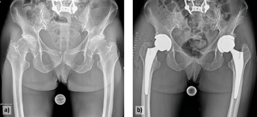 Abb. 2: Hüfttotalendoprothesen-Implantation unter roboterassistierter Ausrichtungsoptimierung und Impingement-Analyse bei einer 47-jährigen Hochrisikopatientin mit einliegender Wirbelsäulenfusion (Hip-Spine-Klassifikation 2B) und beidseitiger Coxarthrose; (a) präoperativ, (b) postoperativ