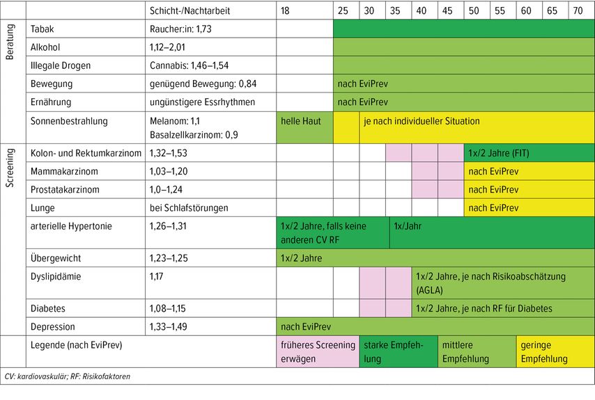 1 Bundesamt für Statistik: 8,6% der Arbeitnehmenden arbeiten im Schichtbetrieb mit rotierenden Arbeitszeiten [Internet]. Bundesamt für Statistik (BFS); 2024. Verfügbar unter: https://www.bfs.admin.ch/asset/de/29145640 2 Wu QJ et al.: J Clin Sleep Med 2022; 18: 653-62 3 Jacot Sadowski I et al.: Swiss Med Forum 2021: 21: 888-894 4 Boini S et al.: Front Public Health 2022; 10: 1034195 5 Liu Q et al.: Int J Epidemiol 2018; 47: 1956-71 6 Wang N et al.: Eur Heart J 2021; 42: 4180-8 7 Vyas MV et al.: BMJ 2012; 345: e4800 8 Torquati L et al.: Scand J Work Environ Health 2018; 44: 229-38 9 Su F et al.: Sleep Med 2021; 86: 90-8 10 Wei F et al.: Sleep Breath 2022; 26: 1509-26 11 Monnaatsie M et al.: Prev Med Rep 2021; 24: 101597 12 Sooriyaarachchi P et al.: Obes Rev 2022; 23: e13489 13 Khosravipour M et al.: Sleep Med Rev 2021; 57: 101427 14 Yang X et al.: Nutr Metab Cardiovasc Dis 2021; 31: 2792-9 15 Wang F et al.: Obes Rev 2014; 15: 709-20 16 Wang Y et al.: Chronobiol Int 2021; 38: 318-33 17 Gan Y et al.: Occup Environ Med 2015; 72: 72-8 18 Gao Y et al.: Chronobiol Int 2020; 37: 29-46 19 Knutsson A, Kempe A: Chronobiol Int 2014; 31: 1146-51 20 Sun M et al.: Obes Rev 2018; 19: 28-40 21 Łagowska K et al.: Am J Hum Biol 2024; 36: e24041 22 Dutheil F et al.: Atherosclerosis 2020; 313: 156-69 23 Clark AB et al.: Adv Nutr 2023; 14: 295-316 24 Chen HT et al.: Front Public Health 2022; 10: 980603 25 Wang N et al.: Medicine 2022; 101: e29211 26 Åkerstedt T, Wright KP: Sleep Med Clin 2009; 4: 257-71 27 Kecklund G, Axelsson J: BMJ 2016; 355: i5210 28 Gao Y et al.: Public Health 2023; 223: 80-6 29 Boivin DB et al.: J Biol Rhythms 2022; 37: 3-28 30 James SM et al.: Shift Curr Sleep Med Rep 2017; 3: 104-12 31 Foster RG, Wulff K: Nat Rev Neurosci 2005; 6: 407-14 32 Fischer D et al.: Chronobiol Int 2017; 34: 1423-38 33 Zhao Y et al.: Int Arch Occup Environ Health 2019; 92: 763-93 34 Torquati L et al.: Am J Public Health 2019; 109: e13-20 35 Xu M et al.: JAMA Netw Open 2023; 6: e2328798 36 Okechukwu CE et al.: Healthcare 2023; 11: 937 37 Lee A et al.: J Korean Med Sci 2017; 32: 1091 38 Angerer P et al.: Dtsch Ärztebl Int 2017; 114: 404-11 39 Hamieh N et al.: BMC Public Health 2022; 22: 1834 40 Richter K et al.: Eur Addict Res 2021; 27: 9-15 41 Hong J et al.: Open Med 2022; 17: 712-31 42 Xie L et al.: OncoTargets Ther 2015; 2817-26 43 Rivera-Izquierdo M et al.: Int J Environ Res Public Health 2020; 17: 1345 44 Sun C et al.: J Clin Oncol 2021; 39: e15600 45 Wang X et al.: Oncotarget 2015; 6: 25046-60 46 Yousef E et al.: Sci Rep 2020; 10: 2012 47 Hu F et al.: SSM Popul Health 2023; 24: 101542 48 Chang WP, Chang YP: J Womens Health 2021; 30: 722-30 49 Bracci M et al.: Int J Environ Res Public Health 2023; 20: 3195 50 Pavlovic MV et al.: Sci Rep 2022; 12: 15520 51 Cai C et al.: Am J Obstet Gynecol 2019; 221: 563-76 52 Stocker LJ et al.: Obstet Gynecol 2014; 124: 99-110 53 Bonzini M et al.: Occup Environ Med 2006; 64: 228-43 54 Bonzini M et al.: BJOG Int J Obstet Gynaecol 2011; 118: 1429-37 55 Uehli K et al.: Sleep Med Rev 2014; 18: 61-73 56 Wöhrmann AM et al.: Shift work and work-family conflict: a systematic review. sozialpolitik.ch: 2020 https://www.sozialpolitik.ch/article/view/3733 ; zuletzt aufgerufen am 18.8.2025 57 EviPrev-Programm: einsehbar unter www.eviprev.ch