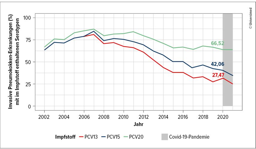 Abb. 1: Anteil (in %) von invasiven Pneumokokken-Erkrankungen bei ≥65-jährigen Personen über die Zeit (2002–2021), welche durch die Serotypen in den verschiedenen Konjugatimpfstoffen abgedeckt gewesen wären (adaptiert nach BAG-Bulletin 2024)4