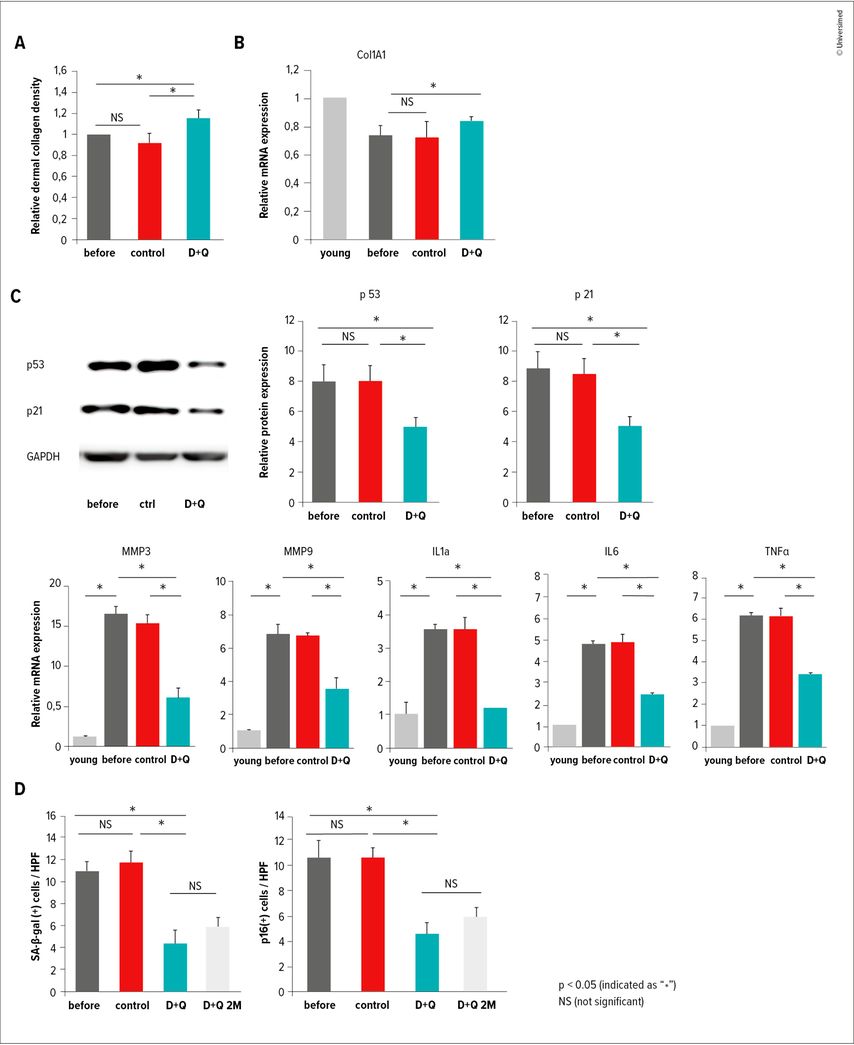Fig. 2: Effet du traitement sénolytique dasatinib+quercétine (D+Q) sur des greffons de peau humaine âgée. Le traitement D+Q induit une restauration structurelle et fonctionnelle du derme: (A) amélioration du dépôt collagénique (H&E, trichrome); (B) augmentation de l’expression de COL1A1; (C) diminution des marqueurs de sénescence p53/p21 et des facteurs du SASP (MMP3, MMP9, IL-1α, IL-6, TNF-α); (D) diminution durable du fardeau sénescent (p16+, SA-β-gal+). Dans l’ensemble, D+Q réduit la sénescence et l’inflammation tout en restaurant la matrice collagénique dermique (adapté de Takaya K et al. 2024, Hickson LTJ et al. 2019, Ruggiero AD et al. 2023, Salamito M et al. 2023, Dąbrowska-Padewska A et al. 2023, Franco AC et al. 2022)2,3,11–14