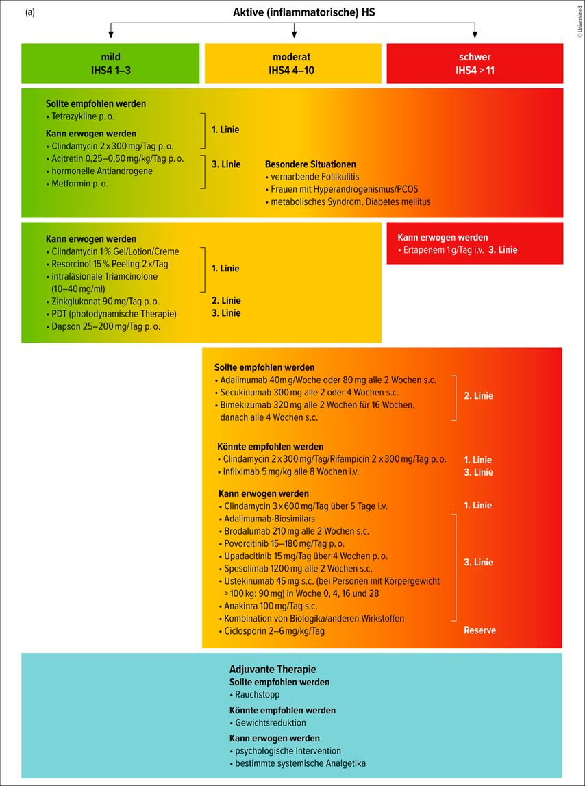 In der Behandlung der HS steht die frühzeitigeTherapie entzündlicher Läsionen im Fokus, um irreversible Gewebedestruktion mit Fistel- und Narbenbildung zu verhindern oder zu verlangsamen.
