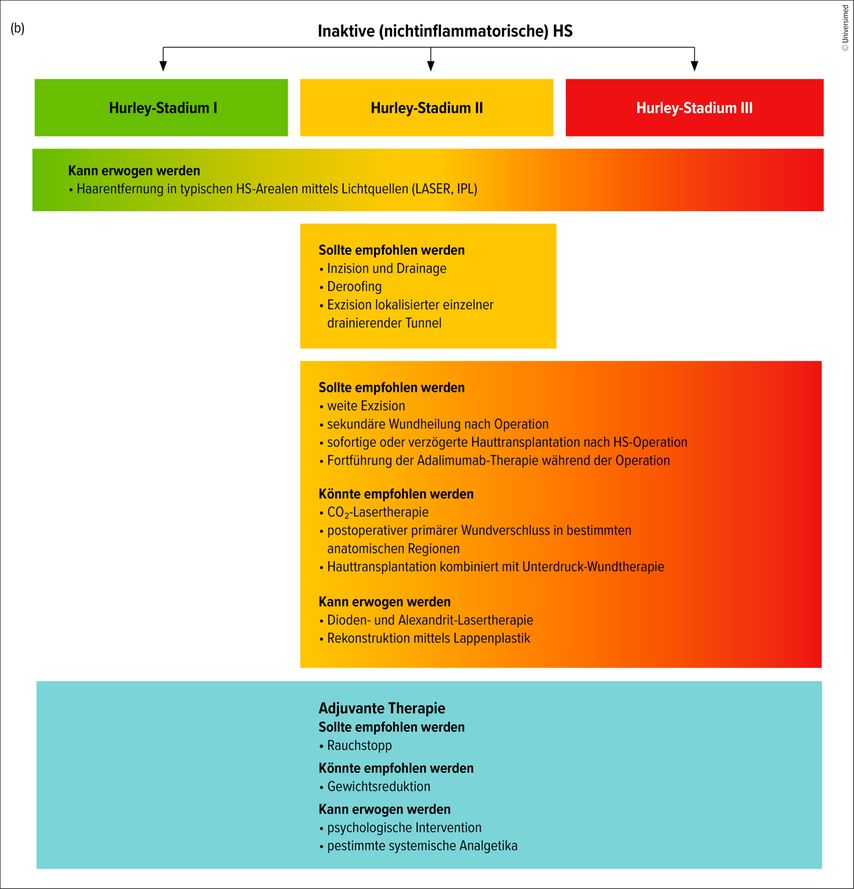 Abb. 1: HS-Behandlungsalgorithmus laut European S2k Guidelines. (a) Behandlung der aktiven (inflammatorischen) HS, (b) Behandlung der inaktiven (nichtinflammatorischen) HS (modifiziert nach Zouboulis CC et al. 2025)6