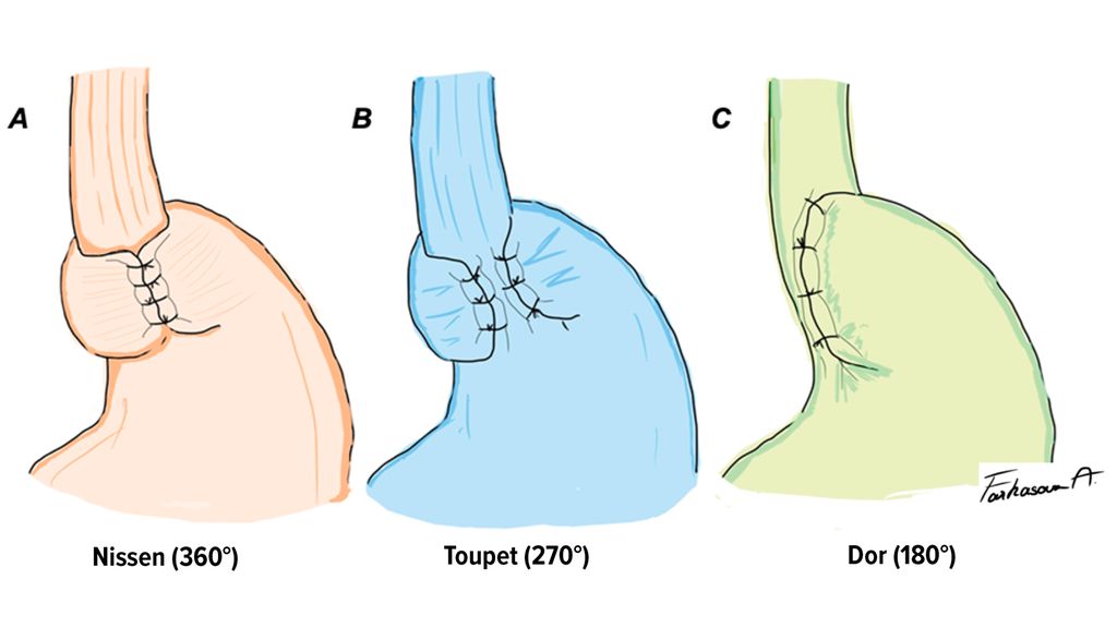 Es existieren zahlreiche Varianten der Fundoplikatio, wobei die drei häufigsten Techniken die Fundoplikatio nach Nissen mit 360°-Manschette, Toupet mit posteriorer 270°-Manschette und Dor mit anteriorer 180°-Manschette sind (Abb.3). In den letzten zehn Jahren ist der Anteil der Nissen-Technik von 52,2% auf 36,7% und der der Toupet-Technik von 44,4% auf 37% zugunsten alternativer Rekonstruktionsverfahren gesunken.16 Dies spiegelt einen Trend zur Individualisierung und zur Berücksichtigung patientenspezifischer Faktoren wider. Weitere Varianten der Fundoplikatio-Manschette sind Watson (anteriore 180°-Manschette), Thal (anteriore 90°-Manschette) oder modifizierte Toupet (240–220° posterior). Eine partielle Fundoplikatio-Manschette wird insbesondere bei Patient:innen mit Ösophagus-Hypomotilität oder bei erhöhtem Risiko für eine postoperative Dysphagie bevorzugt, da sie weniger häufig zu Dysphagie sowie der Unfähigkeit zu rülpsen und zu erbrechen führt als die 360°-Nissen-Fundoplikatio. In den letzten Jahren konnten mehrere randomisierte Studien zeigen, dass die Toupet-Technik im Vergleich zur Nissen-Technik mit einer signifikant geringeren Rate an postoperativer Dysphagie und Blähungen assoziiert ist. Dabei bleiben sowohl die Langzeitkontrolle des Refluxes als auch die Patient:innenzufriedenheit unbeeinträchtigt.17–19 Die Dor-Fundoplikatio bietet nach einer Heller-Myotomie eine effektive Kontrolle des gastroösophagealen Refluxes bei gleichzeitig geringeren Dysphagieraten. Sie wird jedoch überwiegend in Kombination mit einer Myotomie eingesetzt, sodass die Evidenz für ihre Anwendung ohne begleitende Myotomie begrenzt ist.20,21 Wichtig zu wissen ist, dass ein erneuter PPI-Bedarf im langfristigen postoperativen Verlauf nicht selten ist: 44–57% der Patient:innen benötigen 5–15 Jahre nach dem Eingriff weiterhin PPI.22 Hierüber müssen Patient:innen entsprechend gut aufgeklärt werden.