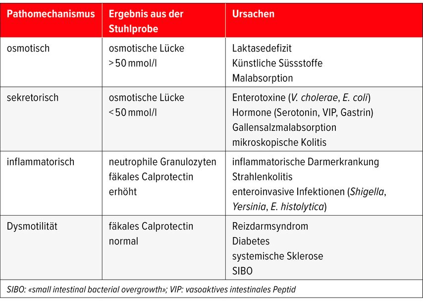 Die chronische Diarrhö wird durch vier Merkmale definiert. Die ersten drei betreffen den Stuhlgang: Er ist zu häufig (öfter als dreimal pro Tag), zu flüssig und zu voluminös (über 200g Stuhl pro Tag). Das vierte Merkmal betrifft die Dauer der Symptome: Dauern sie weniger als zwei Wochen an, so spricht man von einer akuten Diarrhö, ab zwei Wochen von einer persistierenden und ab einer Dauer von mindestens einem Monat wird die Diarrhö als chronisch definiert.1