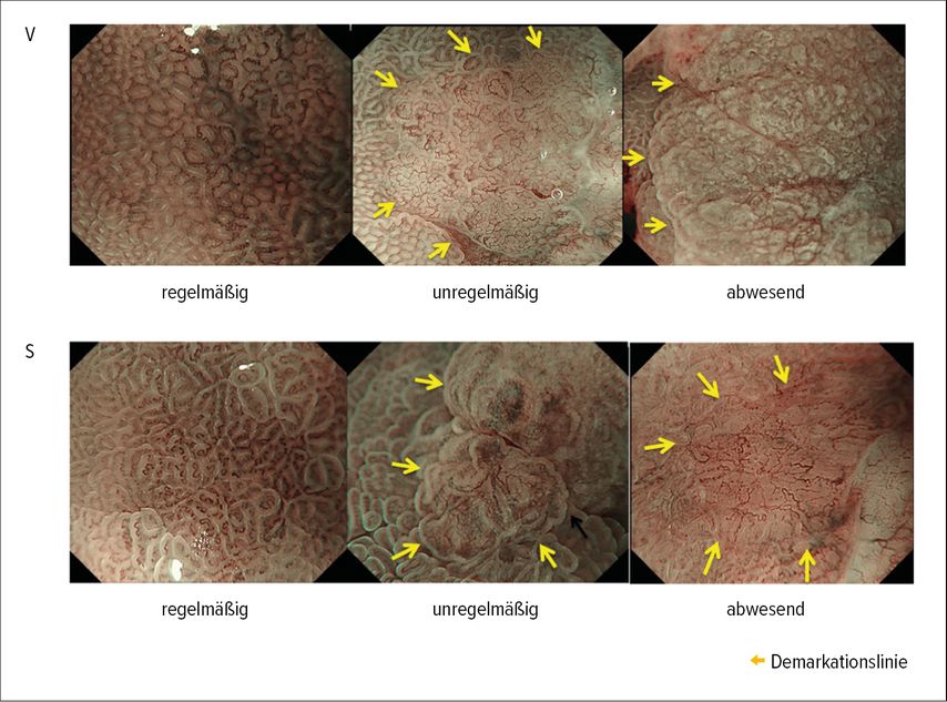 Abb. 1: VS-Klassifikation: Die Gefäßarchitektur (V) und die Oberflächenstruktur (S) werden als regelmäßig/unregelmäßig/abwesend klassifiziert; die Pfeile weisen auf die Demarkationslinie (modifiziert nach Yao K et al. 2020)22