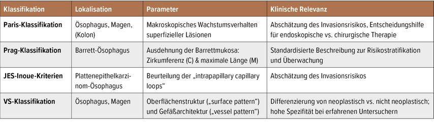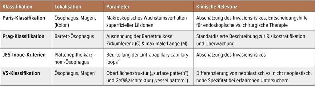 Häufig verwendete Klassifikationen zur Beschreibung von meta-, dys- und (prä-)neoplastischen Läsionen in Ösophagus und Magen umfassen neben der Paris-Klassifikation auch die Prag-Klassifikation, die JES-Inoue-Kriterien und die VS-Klassifikation (Tab.1).