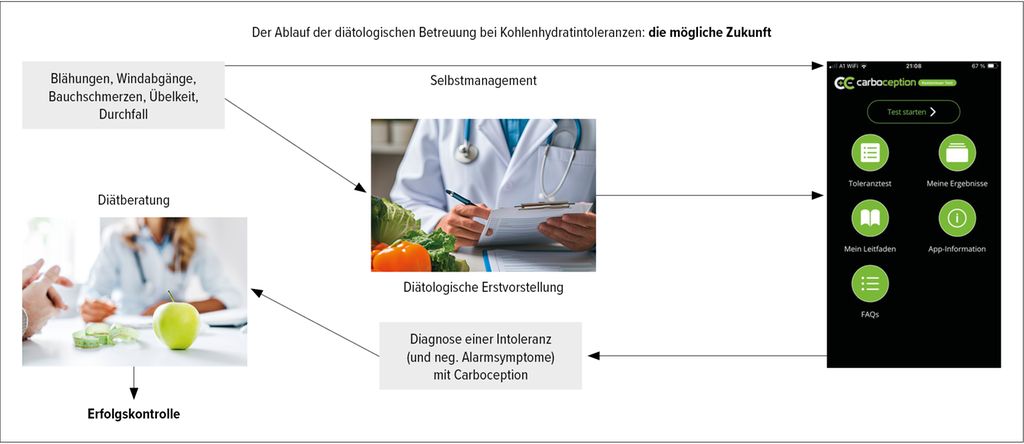 Abb. 2: Zukünftiger Behandlungspfad der Abklärung einer vermuteten Kohlenhydratintoleranz unter Verwendung der «Carboception»-App