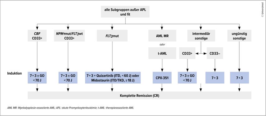 Bei fitten Patient:innen besteht ein kurativer Therapieansatz in Form von intensiver Chemotherapie und je nach genetischem Profil Erweiterung um einen FLT3-Inhibitor oder Gemtuzumab-Ozogamicin. Bei intermediärem und hohem Risiko ist eine allogene Stammzelltransplantation anzustreben.