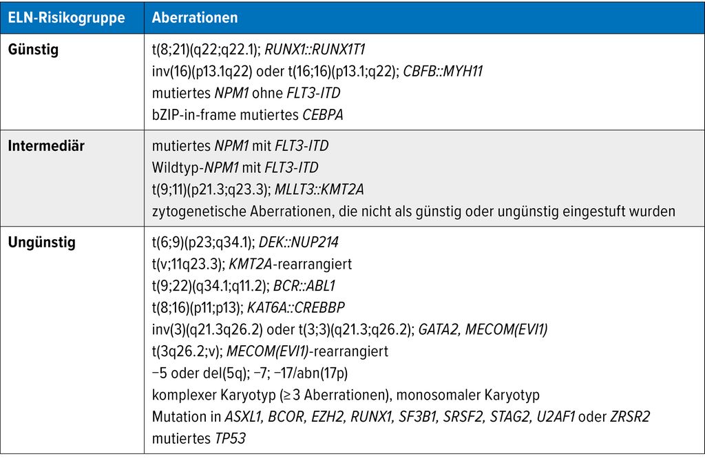 Tab. 1: Molekular-zytogenetische Risikogruppen gemäß der Klassifikation des ELN 2022 (modifiziert nach Döhner H und Onkopedia-Leitlinie AML)2,3