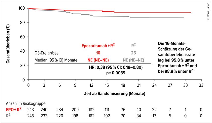 Die am Kongress präsentierten Daten dokumentieren die Überlegenheit von Epcoritamab+R2 bezüglich Gesamtüberleben (OS) mit einer Hazard-Ratio von 0,38 und einem signifikanten p-Wert von 0,0039 (Abb.3). Weiter zeigen die Daten hohe Gesamtansprechraten (ORR) mit einem bemerkenswerten Anteil kompletter Remissionen, die über den historischen Vergleichswerten für R2 alleine liegen.