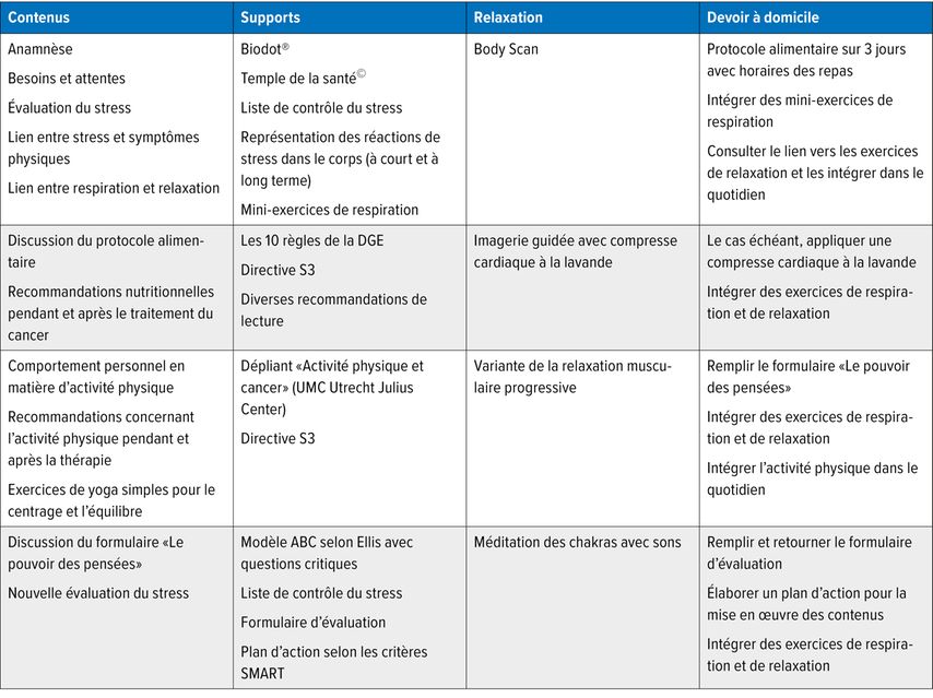 Pour la gestion du stress, différentes techniques de relaxation sont enseignées, pouvant être pratiquées tant durant les séances qu’à domicile de manière autonome. Il s’agit notamment d’exercices respiratoires, corporels et d’imagination, ainsi que de courtes méditations. Un lien vers des exercices correspondants est mis à la disposition des patient·es afin d’approfondir la pratique.12