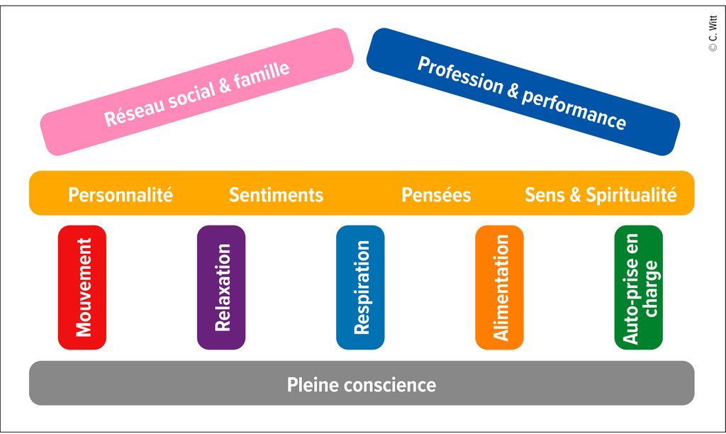 La «Mind Body Medicine» (MBM) recourt à des méthodes intégrées dans un concept d’intervention multimodal, reposant sur des bases scientifiques et provenant majoritairement de la psychologie, des sciences de la nutrition et du sport ainsi que de la médecine complémentaire. Le temple de la santé (Fig.1) est utilisé pour illustrer la MBM.4