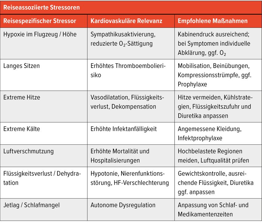 Tab. 2: Die Tabelle fasst zentrale reiseassoziierte Stressoren zusammen, die bei Patienten mit kardiovaskulären Erkrankungen klinisch relevant sein können
