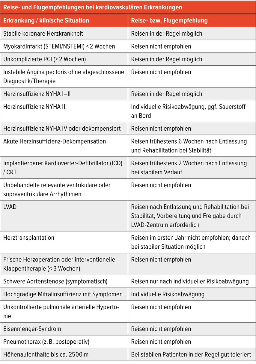 Tab. 1: Die Tabelle gibt eine Übersicht über Reise- und Flugempfehlungen bei häufigen kardiovaskulären Erkrankungen und klinischen Situationen. Für die meisten Empfehlungen existiert keine randomisierte Evidenz; sie beruhen auf pathophysiologischen Überlegungen, klinischer Erfahrung und Expertenkonsens. Die individuelle Beurteilung des klinischen Stabilitätsgrades bleibt entscheidend