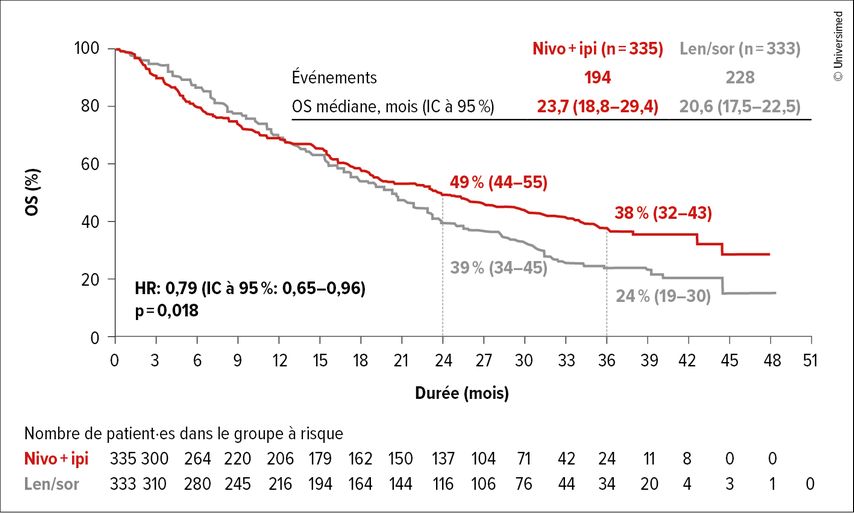 La différence entre les bras de l’étude était statistiquement significative (p=0,018), avec un hazard ratio de 0,79 et un intervalle de confiance à 95% de 0,65–0,96. Les courbes de Kaplan-Meier se sont croisées après environ 15 mois, puis se sont séparées tardivement avec un taux d’OS à 2 ans de 49 par rapport à 39% et un taux d’OS à 3 ans de 38 par rapport à 24% avec un avantage pour l’immunothérapie (Fig. 3).