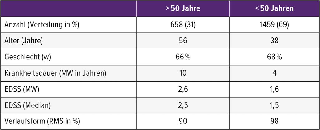 Die häufigsten Therapien in der älteren Kohorte zum Zeitpunkt der letzten Visite waren (in absteigender Häufigkeit): Fingolimod, DMF, Ocrelizumab, Natalizumab, Teriflunomid, Siponimod, Ofatumumab und Cladribin. Die annualisierte Schubrate (ARR) lag in beiden Altersgruppen (über und unter 50 Jahren) bei 0,1 über eine mittlere Beobachtungsdauer von 8 bzw. 6 Jahren. Der mittlere EDSS-Wert zum Zeitpunkt der letzten Visite war in der älteren Gruppe erwartungsgemäß höher (3,1 vs. 1,6). Regressionsanalysen zur Zeit bis zum ersten Schub sowie zur EDSS-Progression bzw. -Regression über 12 Wochen zeigten keine signifikanten Unterschiede zwischen den Altersgruppen. Negative Prädiktoren zur Baseline in Bezug auf die Zeit bis zum ersten Schub und EDSS-Progression waren zum einen eine höhere Schubrate und zum anderen männliches Geschlecht, höheres Alter und niedrigerer EDSS-Ausgangswert.
