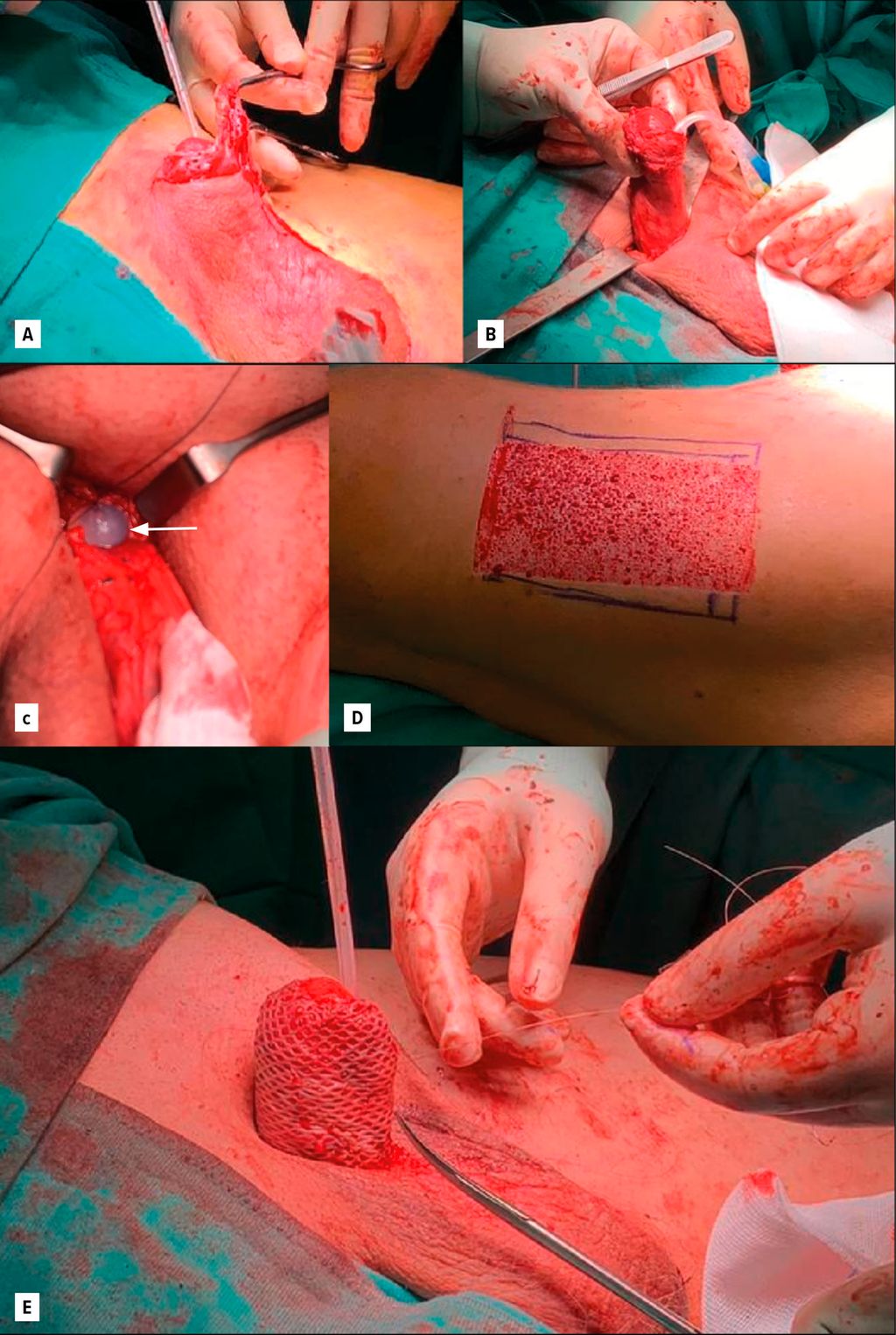 Abb. 1: Operative Schritte – Bild A + B: Freilegung des Penisschaftes („degloving“) aus dem umgebenden Weichteilgewebe; Bild C: Fixation des Penisschaftes; Bild D: Entnahme eines Spalthauttransplantats; Bild E: Mesh-Spalthauttransplantat zur Deckung des penilen Hautdefekts