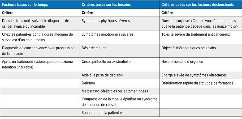 Dans la première, le recours progressif aux soins palliatifs a été comparé à l’intégration précoce. Les spécialistes en soins palliatifs ont seulement été consulté·es pour certains événements pathologiques («trigger», Tab.1), par exemple en cas de progression de la maladie ou d’hospitalisation d’urgence. Il a été démontré que le recours progressif aux soins palliatifs n’est en rien inférieur à l’intégration précoce.3