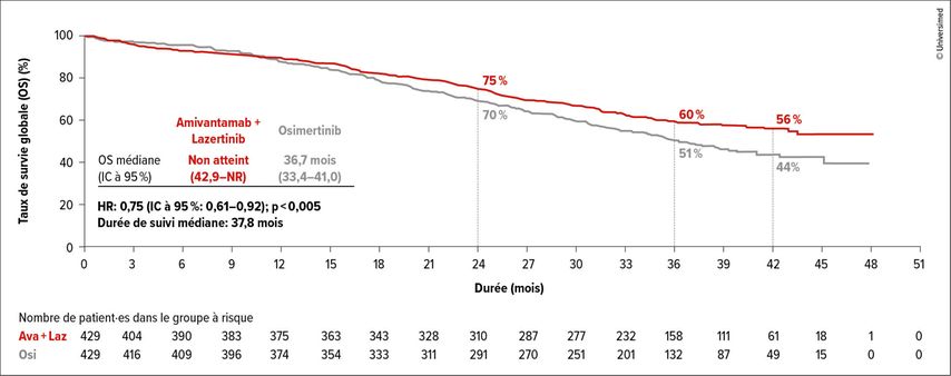 Les données finales sur la survie globale (OS) de l’étude de phaseIII MARIPOSA ont certainement été l’une des présentations les plus discutées à l’ELCC.1 L’étude a comparé l’amivantamab (Ami) en combinaison avec le lazertinib (Laz) et l’osimertinib (Osi) en tant que traitement de première ligne chez des patient·es non traité·es présentant des mutations activatrices de l’EGFR (récepteur du facteur de croissance épidermique) (EGFRm). Pour la première fois, un avantage significatif et cliniquement pertinent en termes de survie a pu être démontré grâce à une combinaison d’inhibiteurs de tyrosine kinase (ITK) de l’EGFR par rapport au traitement standard actuel. Après un suivi médian de 37,8mois, la SG médiane n’était pas encore atteinte dans le bras Ami+Laz (IC à 95%: 42,9 à non atteinte), alors qu’elle était de 36,7mois dans le bras OSI (Fig. 1). Après trois ans, 60% des patient·es du bras combiné étaient encore en vie, contre 51% sous Osi. Des extrapolations basées sur des modèles indiquent un avantage potentiel de survie de plus d’un an (!). De plus, un avantage a été constaté en termes de survie sansprogression intracrânienne (PFS). Ami+Laz se positionne ainsi comme le nouveau standard thérapeutique de première ligne pour les patient·es atteint·es de NSCLC EGFRm.