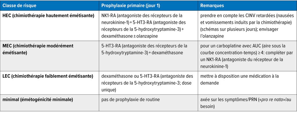 La prophylaxie primaire de l’émèse et des nausées dépend de facteurs spécifiques aux patient·es ainsi que de la classe de risque émétogène du schéma thérapeutique. On distingue quatre classes:
