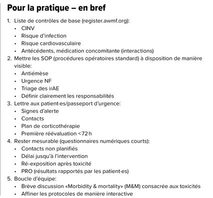 Les effets indésirables constituent une cause fréquente de réduction de dose, d’interruption du traitement ou d’hospitalisations évitables. La directive S3 «Supportive Therapy» (032-054OL, Version 2.0; 2.4.2025) propose un cadre d’information allant de l’émèse à la myélosuppression et à la mucite, jusqu’aux thérapies ciblées. La mise en œuvre rigoureuse des recommandations stabilise la qualité de vie et l’adhésion thérapeutique; des SOP (procédures opératoires standard), des suivis précoces (p.ex. contact téléphonique <72 heures) et des plans d’urgence clairement définis y contribuent.1