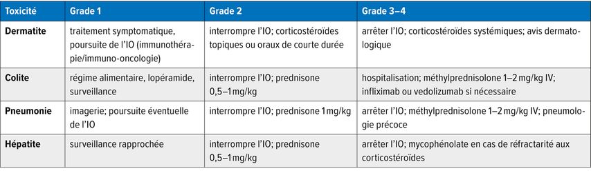 Gérer les toxicités liées à l’immunothérapie (irAE, «immune-related adverse events») selon l’organe concerné et le grade; définir des filières d’urgence claires.