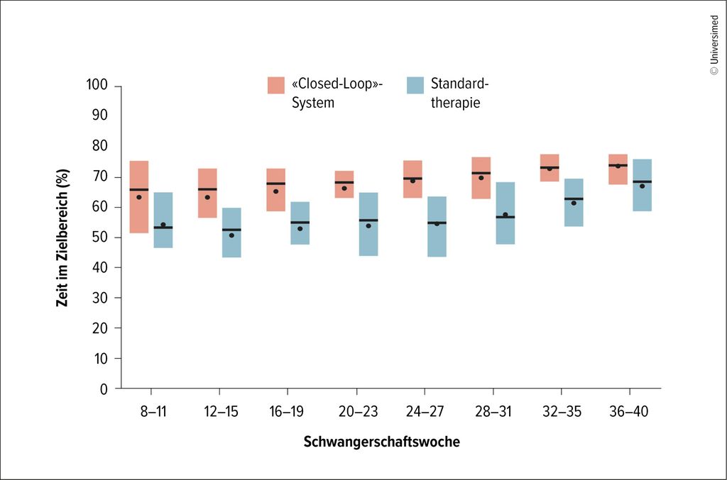 Für Frauen mit Typ-1-Diabetes sei die Schwangerschaft eine besonders herausfordernde Zeit, da sich der Insulinbedarf ändere, erklärte der Experte. Eine unzureichende Blutzuckereinstellung (Dysglykämie) erhöhe das Risiko für Komplikationen, zum Beispiel für schwere Schwangerschaftsverläufe mit dem Verlust des Babys oder schwerwiegende Komplikationen nach der Geburt mit neonataler Hypoglykämie. Die randomisierte kontrollierte CONCEPTT-Studie zur Anwendung von CGM in der Schwangerschaft habe eindeutige Belege dafür geliefert, dass alle Patientinnen mit Typ-1-Diabetes einen Sensor tragen sollten, so Laimer. Interessanterweise seien dabei nur geringfügige Verbesserungen des HbA1c-Wertes beobachtet worden, obwohl der mütterliche Blutzuckerwert signifikant gesunken sei, ohne dass es zu zusätzlichen Hypoglykämien kam. Zudem hatten sich die Häufigkeit von LGA(«large for gestational age»)-Kindern und die Krankenhausaufenthaltsdauer der Säuglinge reduziert.6 Dies verdeutliche, dass es nicht nur darum gehe, den HbA1c-Wert und den Gesamtblutzuckerspiegel zu senken, sondern auch darum, Blutzuckerschwankungen zu reduzieren. Dabei sei der Zielbereich in der Schwangerschaft enger gefasst und liege zwischen 3,5 und 7,8mmol/l. Das Ziel sei eine TiR von 70% (Abb.1), sagte Laimer. Er wies darauf hin, dass der GMI (Glukose-Management-Indikator), der häufig als berechneter HbA1c-Wert zur Beurteilung der Blutzuckereinstellung herangezogen wird, unzuverlässig ist und in der Schwangerschaft nicht empfohlen wird. Für die Anwendung in der Schwangerschaft getestet seien die Systeme myLife CamAPS® FX und Medtronic MiniMedTM 780G.7,8 Bei allen anderen Systemen sei die Entscheidung immer individuell mit der Patientin zu treffen.