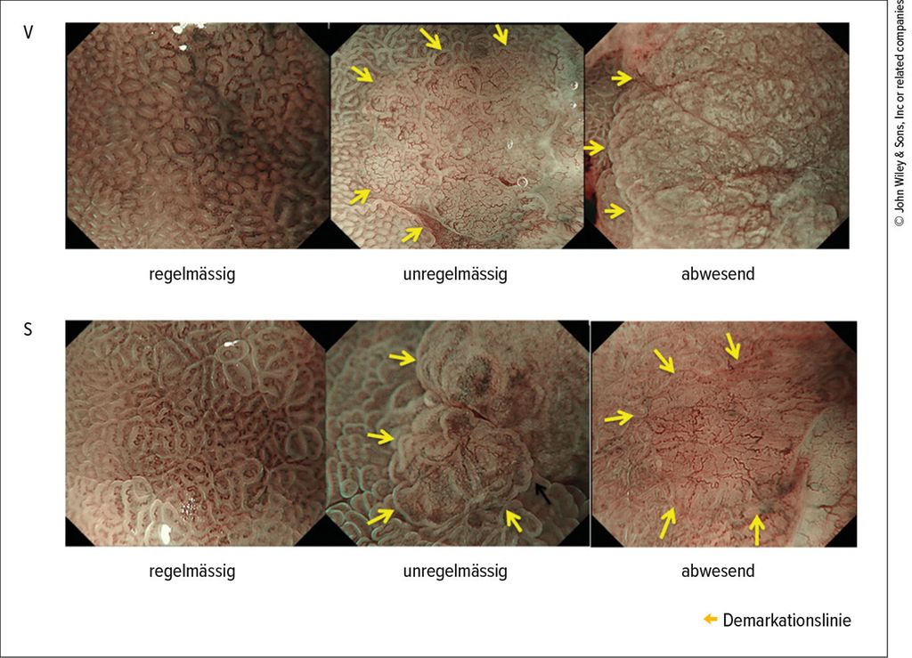 Abb. 1: VS-Klassifikation: Die Gefässarchitektur (V) und die Oberflächenstruktur (S) werden als regelmässig/unregelmässig/abwesend klassifiziert; die Pfeile weisen auf die Demarkationslinie (modifiziert nach Yao K et al. 2020)22