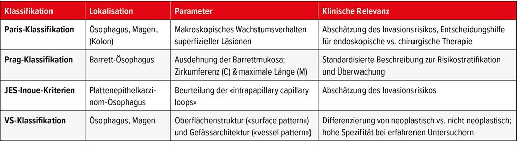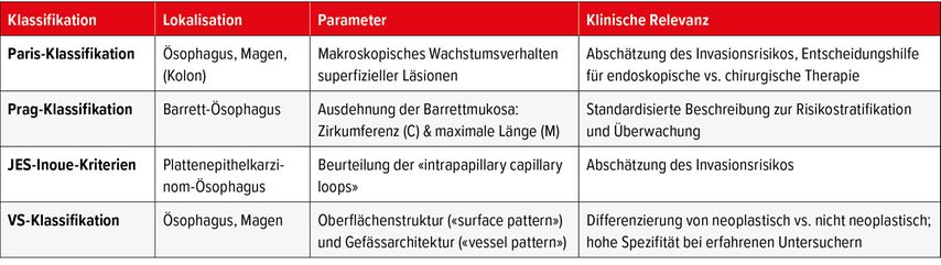 Häufig verwendete Klassifikationen zur Beschreibung von meta-, dys- und (prä-)neoplastischen Läsionen in Ösophagus und Magen umfassen neben der Paris-Klassifikation auch die Prag-Klassifikation, die JES-Inoue-Kriterien und die VS-Klassifikation (Tab.1).