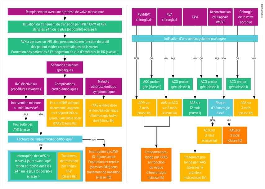 Fig.2: Algorithmes relatifs à la procédure antithrombotique recommandée après tous les types d’interventions sur les valves cardiaques. À gauche: AAS: acide acétylsalicylique; AVK: antagonistes de la vitamine K; HBPM: héparine de bas poids moléculaire; HNF: héparine non fractionnée; INC: interventions non cardiaques; INR: «international normalized ratio»; TIR: temps dans la plage thérapeutique; a: interventions cutanées et ophtalmologiques mineures (y compris les opérations de la cataracte); détartrage, traitement des caries et extractions dentaires; implantation de stimulateurs cardiaques ou d’autres dispositifs cardiaques; ainsi que les examens diagnostiques par cathéter cardiaque. b: prothèses de valve mécaniques en position mitrale ou tricuspide, anciennes générations de prothèses de valve mécaniques toutes positions confondues, hypercoagulabilité héréditaire ou acquise, dysfonction du ventricule gauche (FEVG <35%), fibrillation auriculaire en cas de sténose de la valve mitrale significative ou événement thrombotique sévère au cours des 12 derniers mois (p.ex. accident cardio-embolique, thrombose veineuse profonde, embolie pulmonaire). c: Le traitement de transition doit être initié dès que l’INR atteint une valeur sous-thérapeutique, ainsi que le premier jour après l’opération ou dès que possible. À droite: AAS: acide acétylsalicylique; ACO: anticoagulation orale; RVA: remplacement de la valve aortique; RVM: remplacement de la valve mitrale; RVT: remplacement de la valve tricuspide; TAVI: implantation de valve aortique par voie transcathéter; VM: valve mitrale; VT: valve tricuspide; d: Pour le RVM/RVT par voie transcathéter (p.ex. RVM avec Abbott Tendyne, RVM avec Edwards Sapien M3; RVM avec Medtronic Intrepid; RVT avec Edwards Evoque), il n’existe actuellement aucune directive. Selon les études d’autorisation, il est recommandé d’avoir recours à une ACO prolongée et, en particulier pour le RVT, un traitement de transition par l’héparine en cas d’intervention élective (reprise et adaptée, traduite selon Praz F et al.: Eur Heart J 2025)2