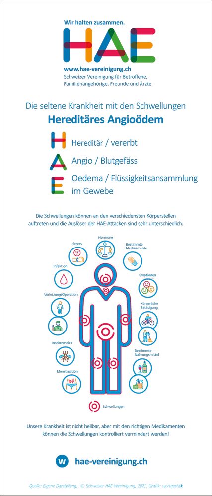 Environ 150 personnes sont touchées par l’AOH en Suisse. À cela s’ajoute le nombre de patient·es qui ne savent pas (encore) qu’il·elles sont atteint·es, car le chemin menant au diagnostic est souvent semé d’embûches: erreurs de diagnostic, tentatives de traitement inefficaces, fortes douleurs et des années d’incertitude avant d’obtenir enfin des réponses claires et un traitement efficace. Helene Saam est présidente d’HAE-Vereinigung Schweiz, une association qui a pour objectif de sensibiliser et d’informer les médecins ainsi que les patient·es sur l’AOH. Cette plate-forme d’échange entre les personnes concernées et leurs proches propose en outre de nombreux témoignages, du matériel d’information et des adresses de contact.