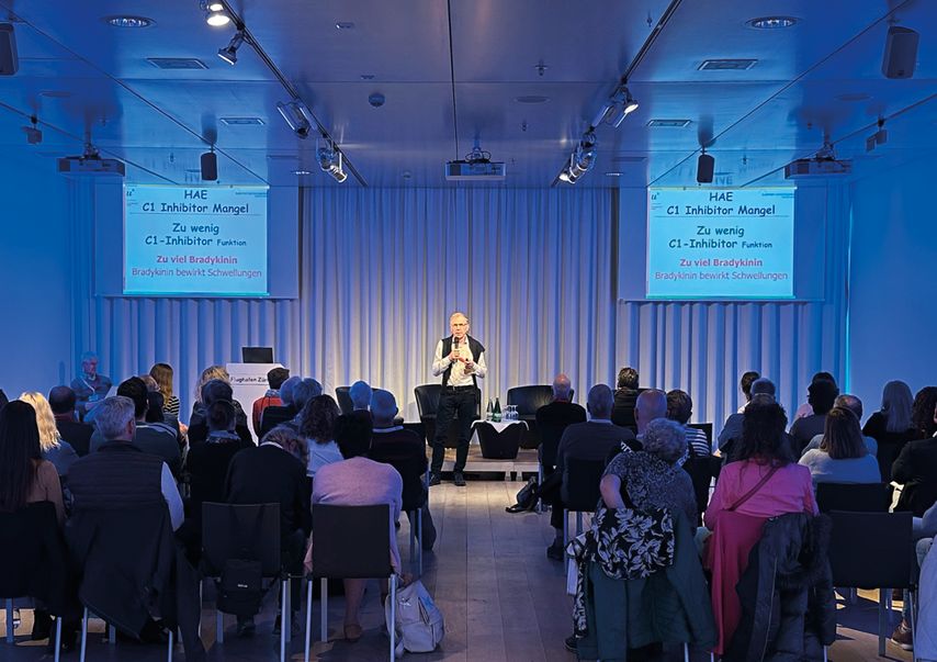 Photos de la réunion de patient·es d’HAE-Vereinigung Schweiz à Zurich en mai 2024 avec le spécialiste suisse de l’AOH, le Pr. Dr méd. Walter A. Wuillemin, Hôpital cantonal de Lucerne