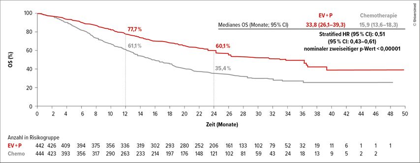 Abb. 1: Gesamtüberleben (OS) unter Enfortumab Vedotin (EV) plus Pembrolizumab (P) vs. Chemotherapie (modifiziert nach Powles T et al.)3