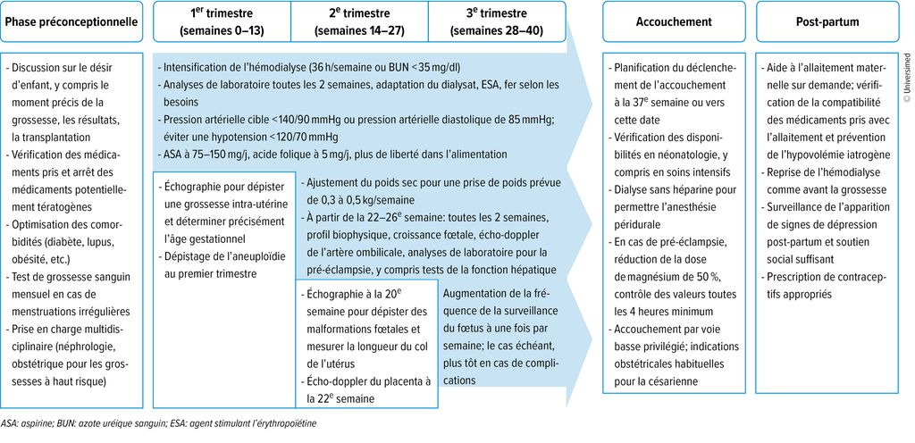 Fig.2: Adaptations de la prise en charge prénatale et péri-partum de routine pour les patientes souffrant d’insuffisance rénale chronique terminale sous dialyse (adaptée selon Oliverio A et Hladunewich MA 2020)5