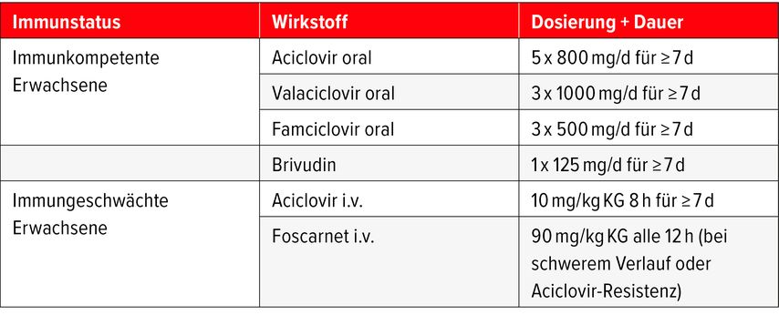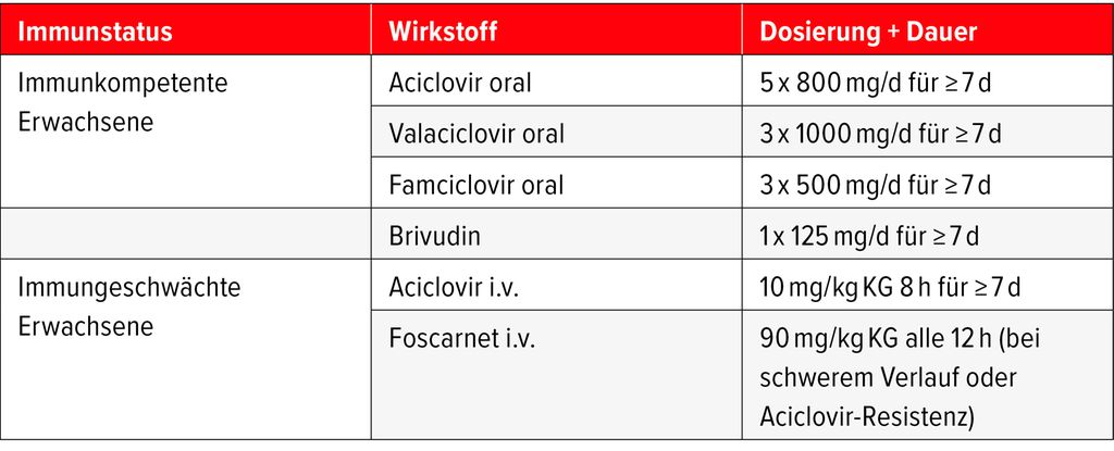 Während ein Herpes zoster im Bereich des Thorax meist gut hausärztlich behandelt werden kann, empfiehlt sich bei einem Auftreten im Kopf-Hals-Bereich meist die interdisziplinäre Zusammenarbeit mit Kolleg:innen aus Augenheilkunde, HNO oder Neurologie. Je nach Ausprägung und Lokalisation können bei Zoster ophthalmicus und Zoster oticus Komplikationen auftreten, die mitunter irreversibel sind. Einen guten Schutz vor Herpes zoster bietet die Impfung, die für gesunde Personen ab 65 Jahren sowie Personen mit Immundefizienz ab 50 resp. 18 Jahren empfohlen wird.