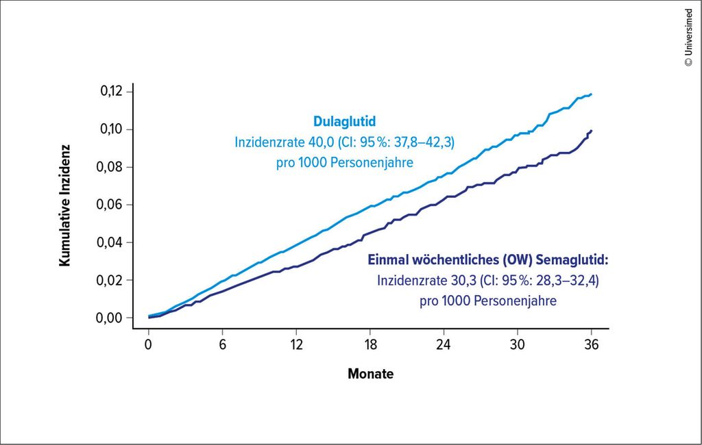 Abb. 1: Kaplan-Meier-Kurve der höheren Rate der kumulativen Inzidenz von 3-Punkte-MACE pro 1000 Personenjahre bei Semaglutid und Dulaglutid (modifiziert nach Tan X et al.)4