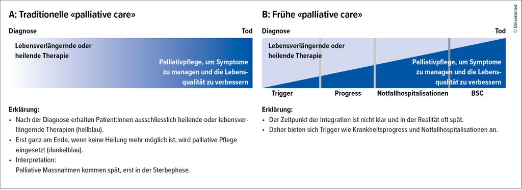 Im vergangenen Jahr wurden zwei Publikationen veröffentlicht, die den Zeitpunkt der Integration von Palliativversorgung untersuchten, eine aus Wien und eine aus Zürich. In der Wiener Studie erfolgte die Integration durchschnittlich 17 Tage vor dem Tod der Patient:innen,5 in der Zürcher Studie waren es 29 Tage.7 Diese Ergebnisse zeigen, dass Palliativversorgung in der Realität oft noch zu spät in den Behandlungsprozess integriert und häufig vor allem als «end-of-life care» wahrgenommen wird (Abb.1).