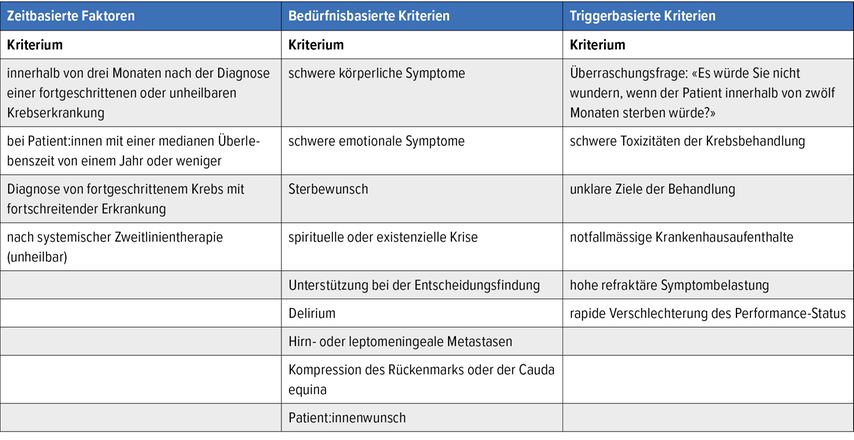 In der ersten Studie wurde der schrittweise Beizug der Palliativversorgung mit der frühen Integration verglichen. Palliativspezialist:innen wurden nur bei bestimmten Krankheitsereignissen («Trigger», Tab.1) hinzugezogen, zum Beispiel bei Krankheitsprogression oder Notfallhospitalisation. Es konnte gezeigt werden, dass der schrittweise Beizug der Palliativversorgung der frühen Integration in keiner Weise unterlegen ist.3