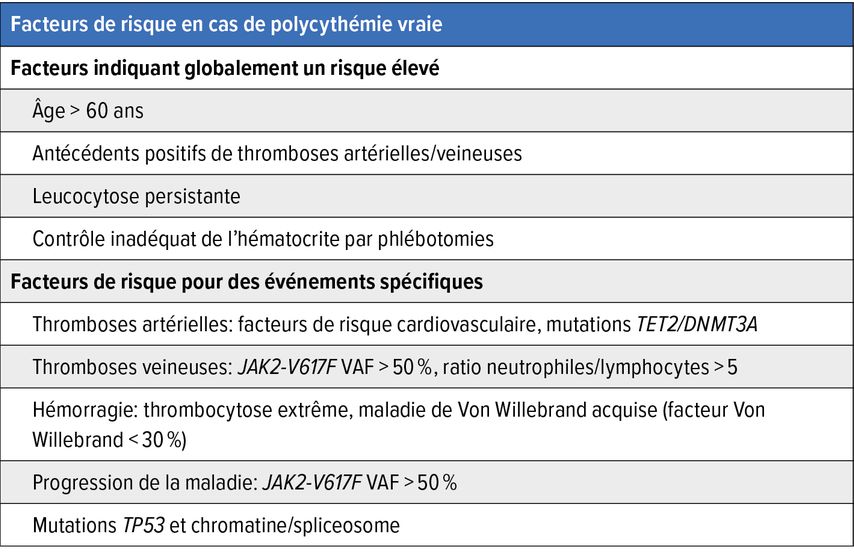 Plusieurs facteurs entrent en ligne de compte dans la définition des patient·es à risque élevé (Tab. 1). Des facteurs de risque supplémentaires s’appliquent en relation avec les thromboses artérielles ou veineuses, les hémorragies et la progression. Une augmentation de la fréquence des variants alléliques (variant allele frequency, VAF) liée à la mutation JAK2-V617F (>50%) revêt aujourd’hui une importance croissante dans la pratique clinique. Dans l’ensemble, de nombreux patient·es qui étaient auparavant classé·es dans la catégorie à faible risque doivent aujourd’hui être considéré·es comme des patient·es à haut risque.