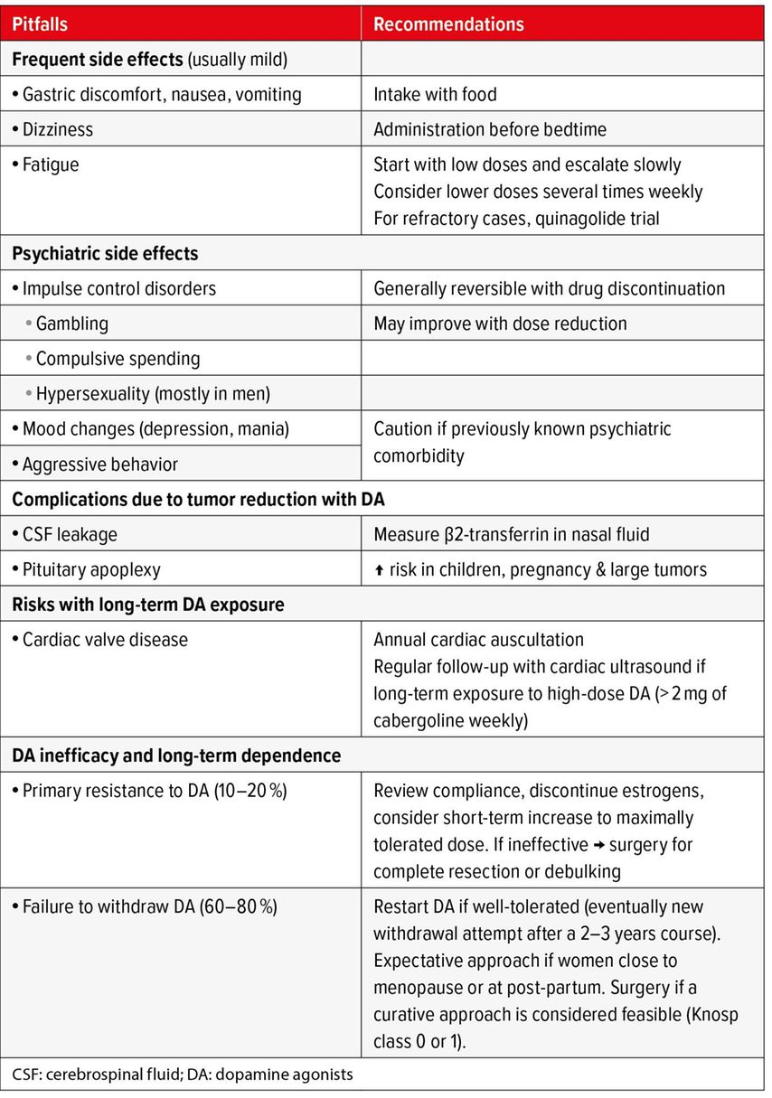 Tab. 2: Pitfalls of dopamine agonists and recommended approach for management (adapted from Petersenn S et al. 2023)1