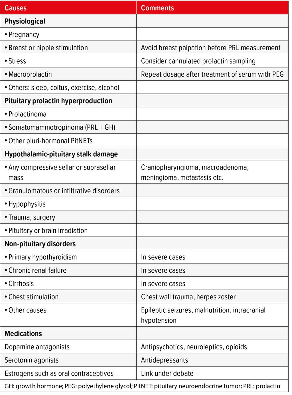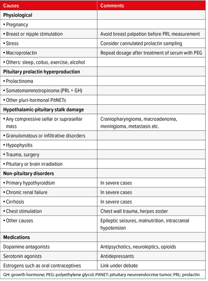 Hyperprolactinemia may arise from various causes, including prolactinomas, other sellar and suprasellar masses, non-pituitary pathologies, and medications. The degree of hyperprolactinemia can provide information about the underlying cause. Prolactin levels greater than 200ng/ml (or µg/l) indicate a macroprolactinoma and should prompt request for a pituitary MRI. If the prolactin elevation is moderate (less than 100ng/ml or less than five times the upper limit of normal) and there is no evident etiology, the blood measurement should be repeated with cannulated sampling to assess for stress-related hyperprolactinemia. Macroprolactin, defined as the presence of greater than 40% prolactin aggregates related to IgG, which are biologically inactive, should be excluded if hyperprolactinemia is asymptomatic. Pituitary adenoma size and serum prolactin levels tend to correlate strongly. Any discrepancy should prompt consideration of other possible causes, particularly a pituitary stalk effect resulting in hyperprolactinemia due to decreased dopaminergic tone on otherwise normal lactotroph cells. Another exception is some cystic macroprolactinoma, which may be associated with lower prolactin levels. Classic causes of hyperprolactinemia that must be rigorously excluded are shown in Table 1.