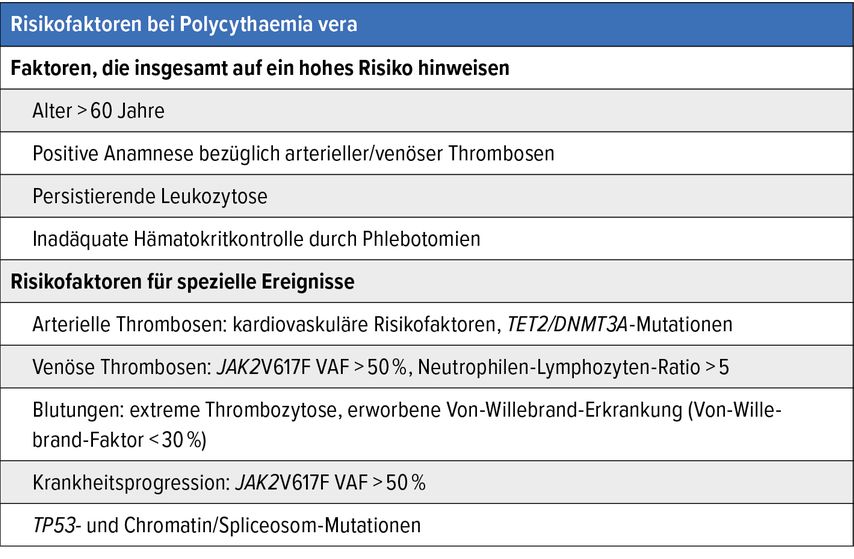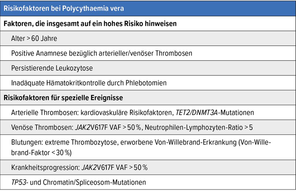 In die Definition der Hochrisikopatient:innen fliessen mehrere Faktoren ein (Tab.). Zusätzliche Risikofaktoren gelten im Zusammenhang mit arteriellen oder venösen Thrombosen, Blutungen und Progression. Einer gesteigerten «variant allele frequency» (VAF) im Zusammenhang mit der JAK2V617F-Mutation (>50%) kommt in der klinischen Praxis mittlerweile wachsende Bedeutung zu. Insgesamt müssen viele Patient:innen, die früher der Niedrigrisikokategorie zugeordnet waren, heute wohl als Hochrisikopatient:innen eingestuft werden.