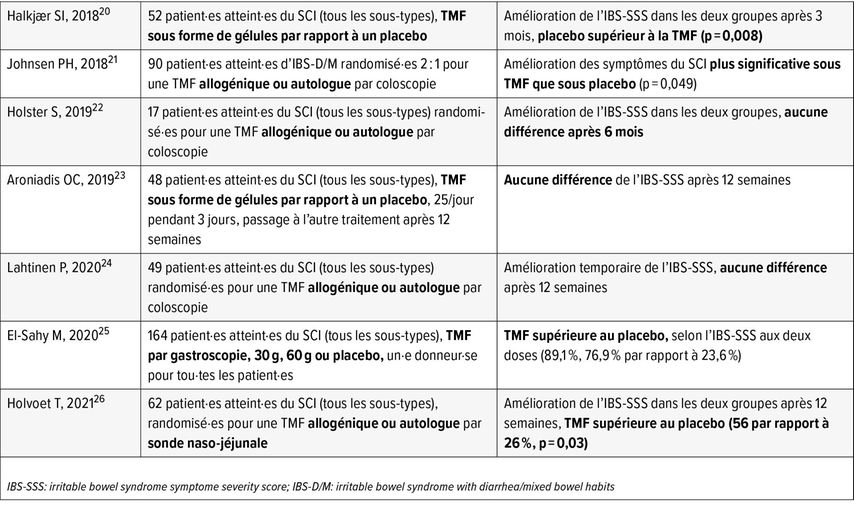 Les résultats des études sur la TMF en cas de syndrome du côlon irritable (SCI) sont très hétérogènes (Tab. 1). Actuellement, les méta-analyses ne fournissent aucune preuve claire d’un bénéfice.11