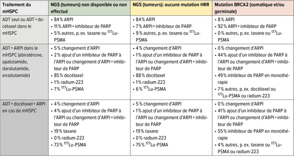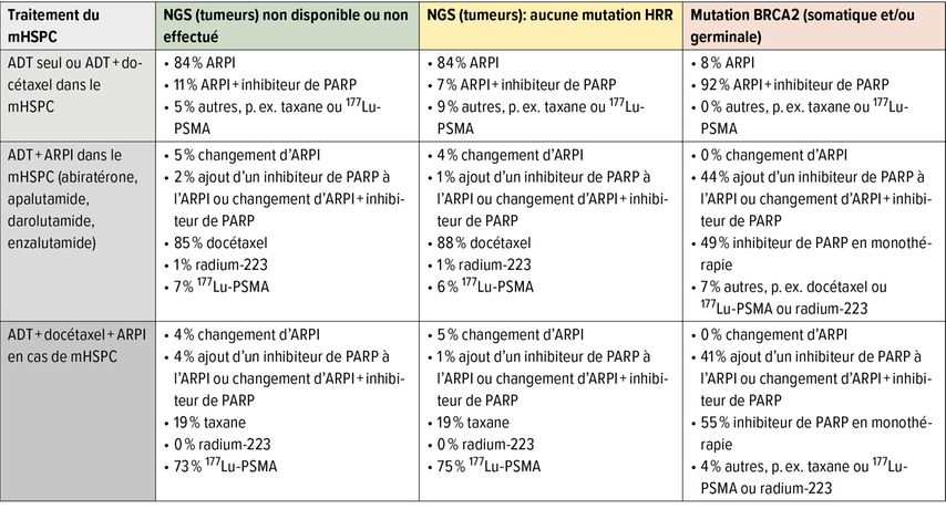 Le Tableau 1 résume les questions posées en rapport avec le traitement séquentiel. Sont concerné·es, d’une part, les patient·es pour lesquel·les aucun test moléculaire n’était disponible et, d’autre part, les patient·es pour lesquel·les le test a été réalisé et aucune mutation pertinente n’a été identifiée. En outre, les patient·es présentant une mutation pathogène du gène BRCA2 ont été interrogé·es.