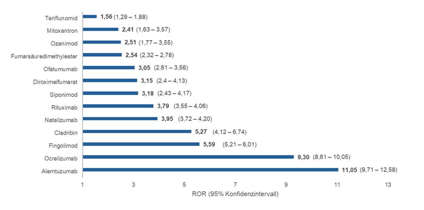 Um das relativ häufigere Auftreten von VZV-Infektionen im Vergleich zu anderen Arzneimitteln zu erfassen, berechneten Balshi und Kolleg:innen die «reporting odds ratio» (ROR) der einzelnen DMT. Für die Berechnung wurden die individuellen Anteile der VZV-Infektionen verglichen mit den entsprechenden Anteilen aller anderen in der Datenbank gelisteten Arzneimittel. Ausgeschlossen wurden Meldungen, bei denen die DMT nicht für die Behandlung der MS eingesetzt wurde, mehr als eine DMT vor der VZV-Infektion gegeben wurde oder Kortikosteroide als Begleitmedikation eingesetzt wurden.