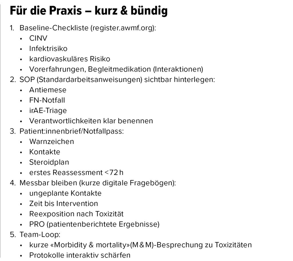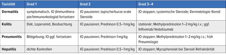 Immuntherapie-Toxizitäten (irAE, «immune-related adverse events») organbezogen und gradabhängig managen; klare Notfallwege definieren.