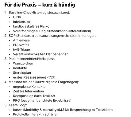 Nebenwirkungen sind ein häufiger Grund für Dosisreduktion, Unterbruch oder vermeidbare Hospitalisation. Die S3-Leitlinie «Supportive Therapie» (032-054OL, Version 2.0; 2.4.2025) bietet einen Informationsrahmen von Emesis über Myelosuppression und Mukositis bis zu zielgerichteten Therapien. Konsequente Umsetzung der Empfehlungen stabilisiert Lebensqualität und Therapieadhärenz; hilfreich sind SOP (Standardarbeitsanweisungen), frühe Follow-ups (z.B. Telefonkontakt <72 Stunden) und definierte Eskalationspfade.1