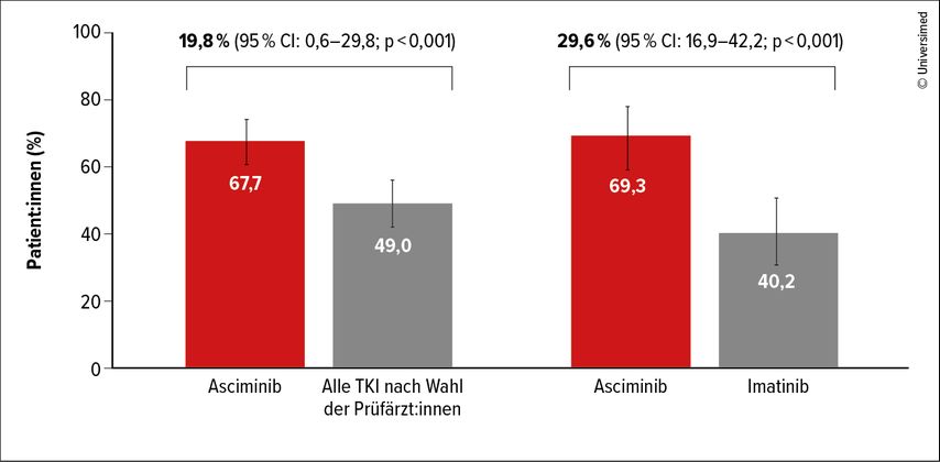 Abb. 1: «Major» molekulare Response nach 48 Wochen unter Asciminib vs. Komparator-TKI nach Wahl der Prüfärzt:innen bzw. Imatinib (modifiziert nach Hughes TP et al.)8