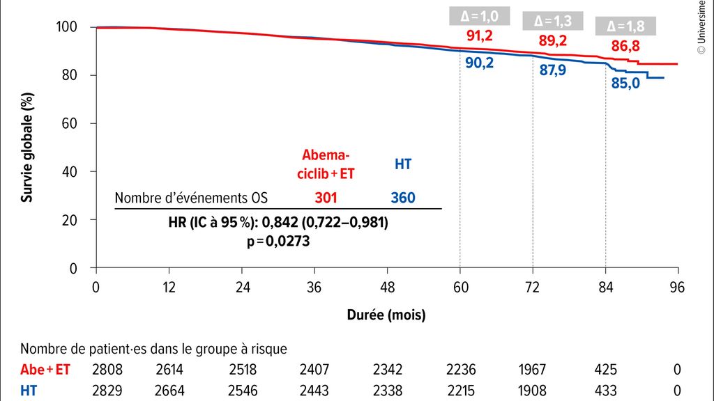 L’abemaciclib a démontré un allongement statistiquement significatif de l’OS chez les patient·es atteint·es d’un cancer du sein HER2-/HR+, à haut risque et avec atteinte ganglionnaire positive.