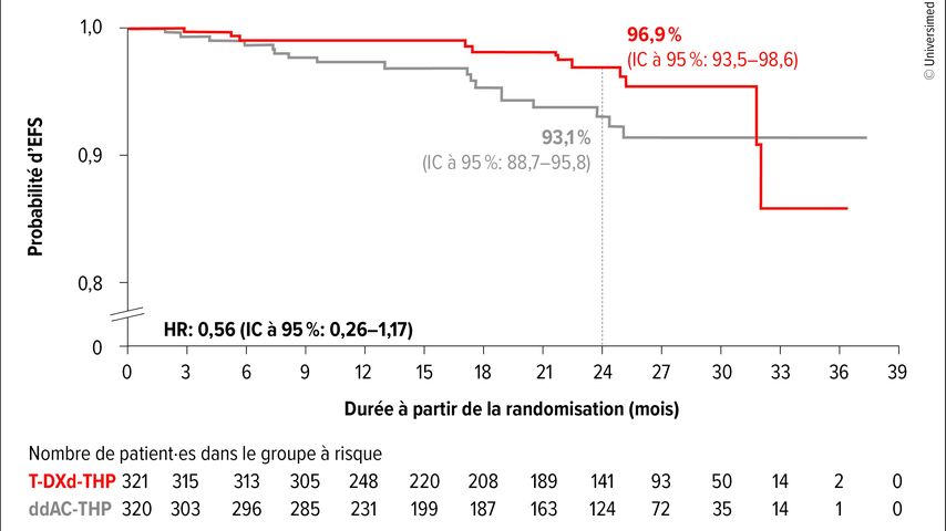 Dans les trois bras de l’étude, 99,7% vs 97,5% vs 99,0% des patient·es randomisé·es ont reçu le traitement de l’étude, et 97,2% vs 93,8% vs 95,8% ont finalement subi une résection. L’âge médian était de 50 ans; 72–73% présentaient une tumeur HR-positive et 88–89% un statut ganglionnaire positif. Dans la comparaison des bras de l’étude avec T-DXd-THP versus ddAC-THP, une pCR a été obtenue chez 67,3% versus 56,3% des patient·es. L’écart absolu était de 9,1% (61,4% vs 52,3%) dans le groupe HR-positif et de 16,1% (83,1% vs 67,1%) dans le groupe HR-négatif. L’avantage du T-DXd par rapport au ddAC en termes de survie sans événement (EFS) n’a pas encore atteint la signification statistique, avec un rapport de risque (HR) de 0,56 pour une maturité des données de 4,5% (IC à 95%: 0,26–1,17). Les courbes de Kaplan-Meier se séparaient précocement, avec des taux d’EFS à 24 mois de 96,9% contre 93,1% (Fig.1). Le profil de sécurité était plus favorable sous T-DXd-THP que sous ddAC-THP. Des effets indésirables de grade≥3 sont survenus chez 37,5% contre 55,8% des patient·es, et des effets indésirables cliniquement significatifs chez 10,6% contre 20,2%. Une pneumopathie interstitielle/pneumopathie liée au traitement a été observée chez 4,4% contre 5,1% des patient·es et un dysfonctionnement ventriculaire gauche chez 1,3% contre 6,1%. Les effets indésirables ont entraîné un retard opératoire chez 3,4% contre 2,6% des patient·es. L’arrêt d’au moins un médicament de l’étude est survenu chez 37,8% contre 54,5% des patient·es pour cause d’effets indésirables; 14,1% contre 9,9% ont interrompu l’ensemble du traitement.